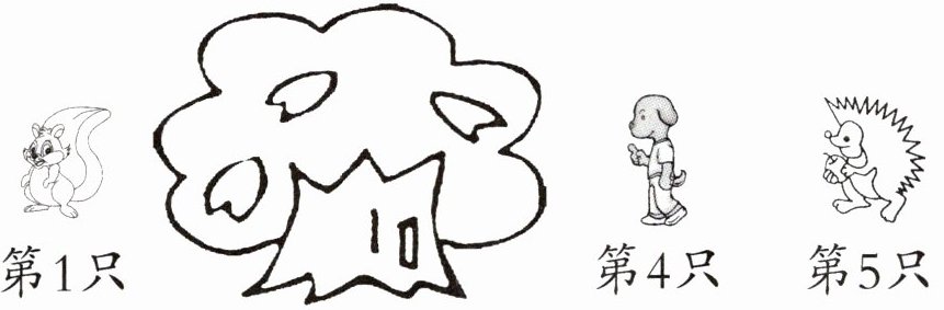 大树遮住的小动物是第$\boxed{}只和第\boxed{}$只,遮住了$\boxed{}$只。一共有$\boxed{}$只小动物。