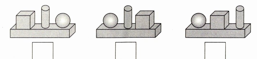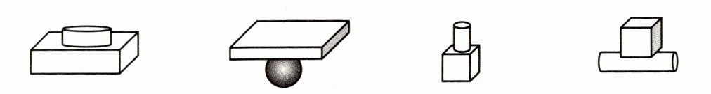 2. 先放一个长方体,再在长方体的上面放一个圆柱,然后在圆柱的左边放一个球,最后在圆柱的右边放一个正方体。下面的图形中,搭得对的画“√”。