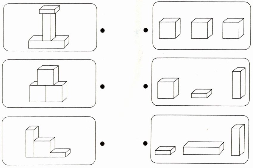 3. 左边的图形分别是由右边哪几个图形搭起来的?用线连一连。