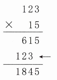 $ \begin{array}{r} 123 \\ ×\quad15 \\ \hline 615 \\ 123\quad\leftarrow \\ \hline 1845 \end{array} $