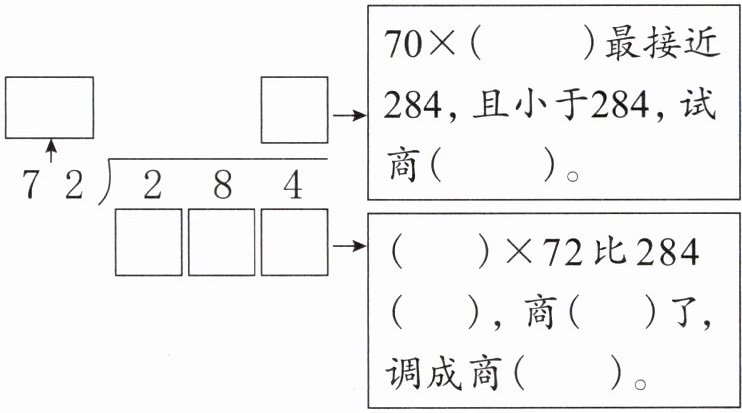 2. 把除数看小了试商,有时商会偏____,此时,要把商调____。