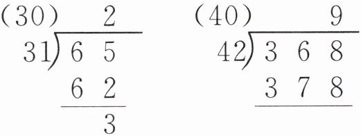 $\begin{array}{r} 2 \\ 31\enclose{longdiv}{65} \\ 62 \\ \hline 3 \end{array} $