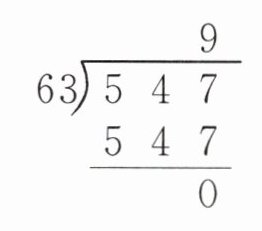 \begin{array}{r} 9 \\ 63\enclose{longdiv}{547} \\ 547 \\ \hline 0 \end{array} $