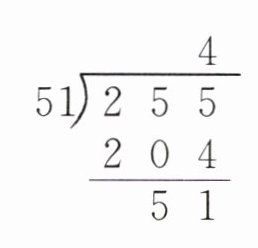 \begin{array}{r} 4 \\ 51\enclose{longdiv}{255} \\ 204 \\ \hline 51 \end{array} $