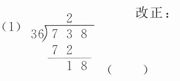 $\begin{array}{r} 20\\ 36\enclose{longdiv} {738}\\ 72\\ \hline 18\end{array} $