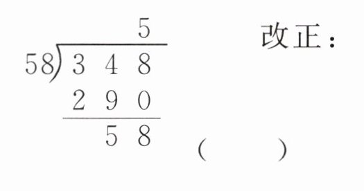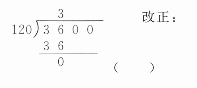 $\begin{array}{r}5\\58\enclose{longdiv} {348}\\290\\\hline58\end{array} $( ) 改正: $\begin{array}{r}3\\120\enclose{longdiv} {3600}\\36\\\hline0\end{array} $( ) 改正:
