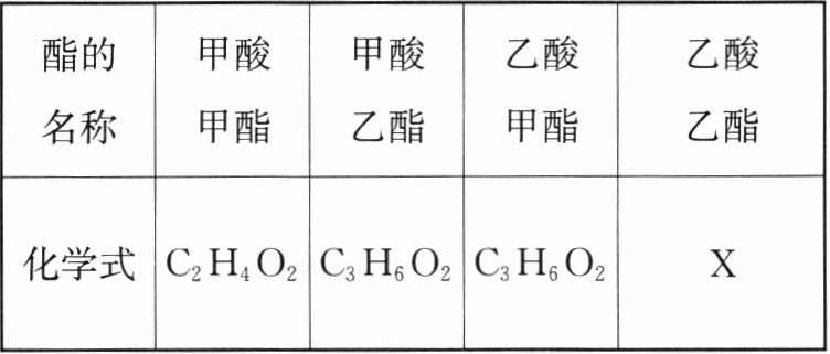 (3)根据表格中的信息,可以看出酯的名称与化学式之间存在一定的规律。甲酸某酯的化学式中,碳原子数为2,氢原子数为4,氧原子数为2,且另一个醇羟基部分碳原子数加1;乙酸某酯的化学式中,碳原子数为3,氢原子数为6,氧原子数为2,且另一个醇羟基部分碳原子数加1.因此,可以推测乙酸乙酯的化学式中,碳原子数应为4(乙酸部分3个+乙醇部分1个),氢原子数应为8(根据酯化反应原理,氢原子数应为醇羟基部分氢原子数的2倍加乙酸部分氢原子数减去反应脱去的水的氢原子数2,即$6+2- 2×1=8$),氧原子数应为2(保持酯的基本结构)。所以,X的化学式为$C_{4}H_{8}O_{2}$。