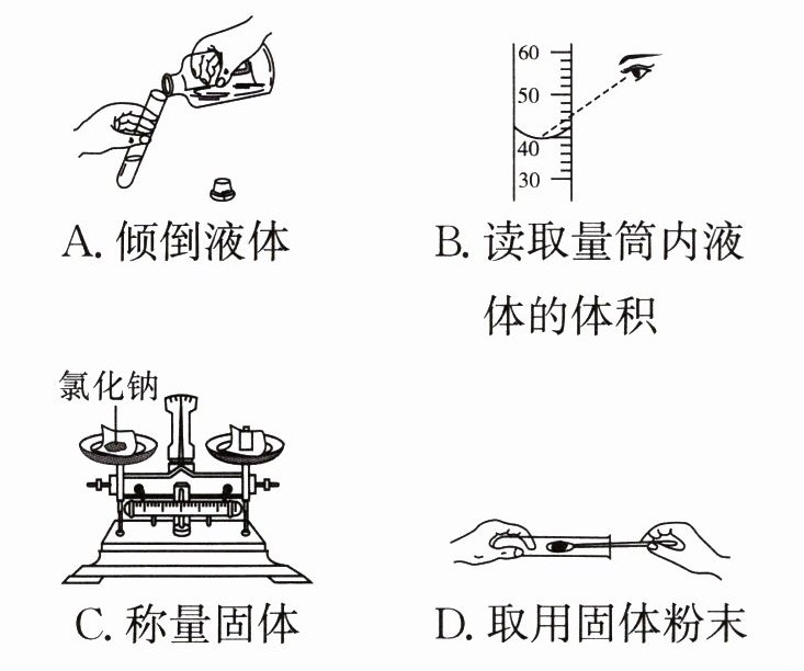 解析:倾倒液体时,将试剂瓶瓶塞倒放在实验台上,标签朝向手心,试剂瓶口紧挨试管口,将液体试剂缓缓倒入,A 正确;读取量筒内液体的体积时,先将量筒放平,视线应与量筒内液体凹液面的最低处保持水平,图中采用了俯视的方法读数,B 不正确;称量氯化钠,左物右码,并且托盘中垫有小纸片,C 正确;往试管里装入固体粉末时,为避免试剂沾在管口和管壁上,可先将试管横放,把盛有试剂的药匙(或用小纸条折叠成的纸槽)小心地送至试管底部,然后把试管竖立起来,D 正确。
