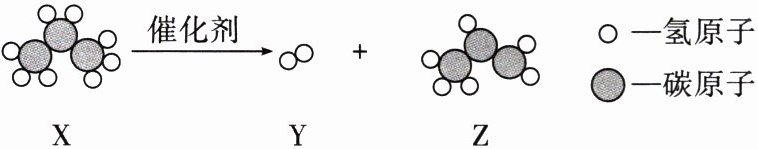 解析:分析图示,X 的化学式为${C3H8}$,A 错误;该反应是化学变化,反应前后分子种类一定改变,B 错误;分析图示,Y 只含有氢元素,燃烧生成水,Z 含有碳、氢元素,在${O2}$中充分燃烧的产物是二氧化碳和水,则产物不相同,C 错误;原子是化学变化中的最小粒子,反应前后原子个数不变,D 正确。