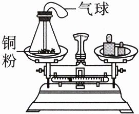 解析:铜粉加热后生成氧化铜,由红色变为黑色;加热铜粉时气体膨胀,气球可以防止由于气压变大使橡胶塞弹出;铜粉加热结束后,由于温度较高气体膨胀,此时气球是鼓的,有一个向上的浮力,若此时放在天平的左盘,会使指针偏右,所以应冷却至室温再将锥形瓶放在天平上称量;无法确定反应物是否完全反应,所以不能得出反应前瓶内铜粉和氧气的总质量一定等于生成氧化铜的质量的结论。