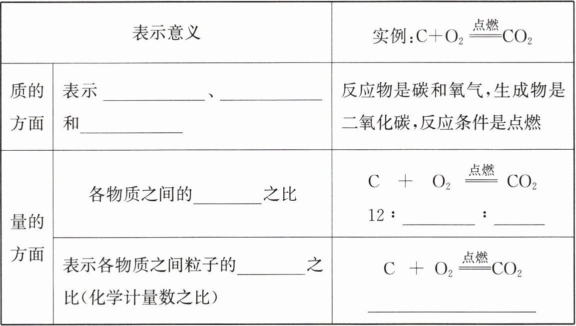 2.化学方程式的意义包括质的方面和量的方面。质的方面表示反应物、生成物和反应条件;量的方面表示各物质之间的质量之比和粒子个数之比(化学计量数之比)。对于$C + O_2\xlongequal{点燃}CO_2$,从质的方面,反应物是碳和氧气,生成物是二氧化碳,反应条件是点燃;从量的方面,根据相对原子质量,碳的相对原子质量为12,氧气的相对分子质量为32,二氧化碳的相对分子质量为44,所以各物质之间的质量之比为$12:32:44$,化学计量数之比为$1:1:1$。