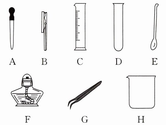 (1)本题考查实验室常用仪器的识别。观察图中仪器,根据常见仪器的形状和用途,D是用于少量试剂的反应容器试管,F是提供热源的酒精灯。