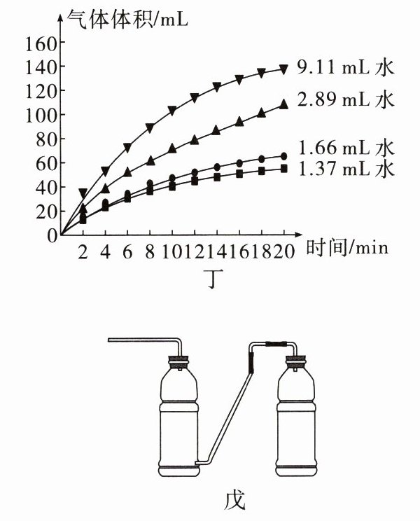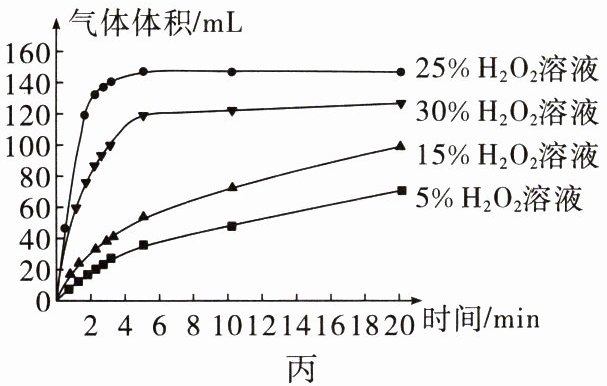 小组设计了图乙实验装置,用表中溶质质量相等的四组过氧化氢溶液进行实验。在集气瓶中加满水,锥形瓶中加入0.2g MnO2,注入溶液,记录并处理20min内的数据如图丙。