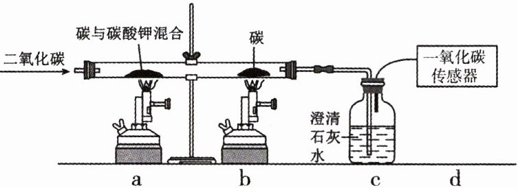 。(2)查阅资料可知碳酸钾是碳与二氧化碳反应的催化剂,利用下图装置进行验证(a、b 两处碳的质量相同):煅烧固体前向装置中通入二氧化碳,目的是排除装置中的空气。实验时先煅烧 b 处固体,60 s 时 d 处检测到一氧化碳;停止煅烧 b 处固体,待装置冷却,传感器示数归零后,再煅烧 a 处固体,10 s 时检测到一氧化碳。