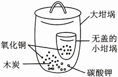 8. 倪慎枢在《采铜炼铜记》中详细记载了古法炼铜的方法。实验小组模拟古法炼铜进行实验:对下图所示坩埚进行高温加热,观察到大坩埚、小坩埚内都出现红色固体。