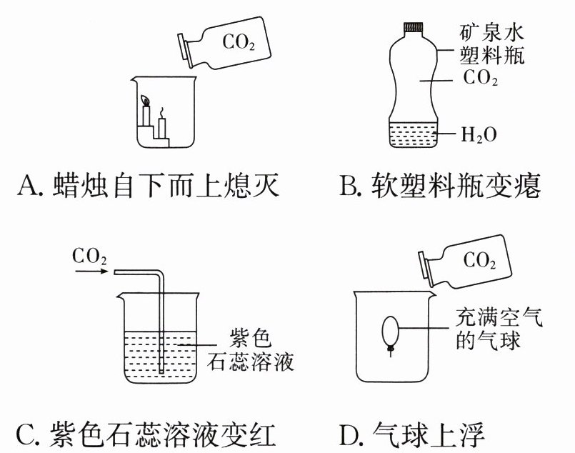 )。(A. 蜡烛自下而上熄灭)(B. 软塑料瓶变瘪)(C. 紫色石蕊溶液变红)(D. 气球上浮)