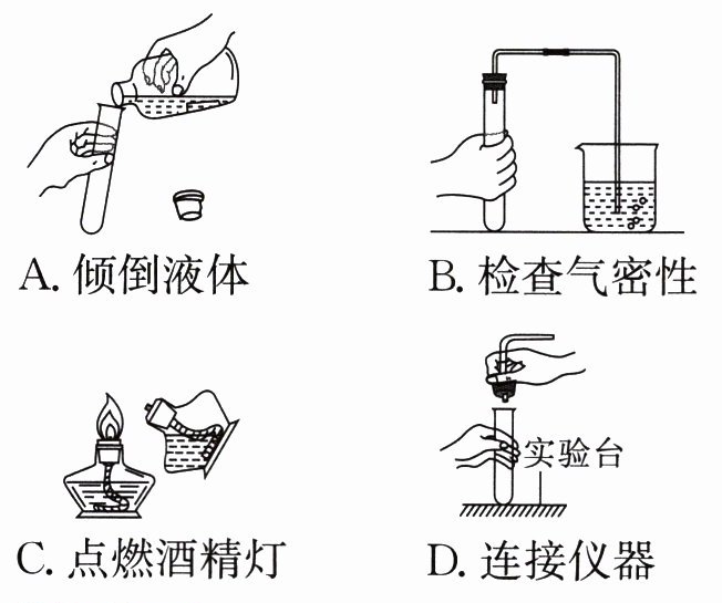 D选项:连接仪器时,应把橡皮塞慢慢转动着塞进试管口,切不可把试管放在桌上再使劲塞进塞子,以免压破试管,图中操作错误,故D选项错误。
