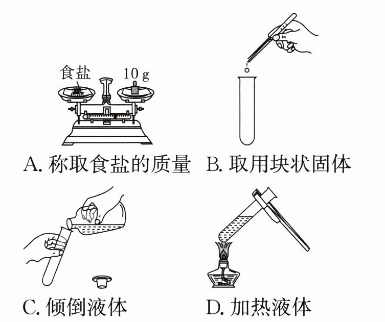 C选项:图中加热烧杯中的液体时没有垫石棉网,烧杯不能直接加热,应垫石棉网加热,故C选项错误。