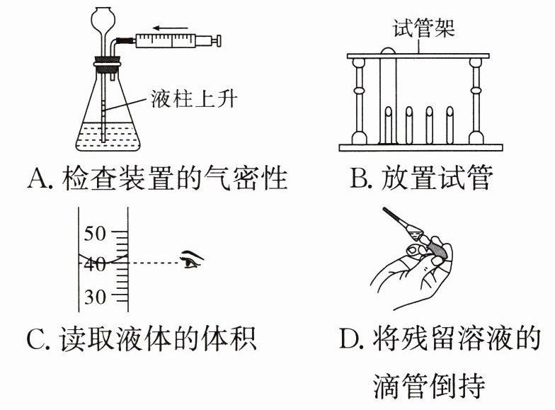 D选项:将残留溶液的滴管倒持,会使残留溶液倒流进入胶头,腐蚀胶头,该操作不正确。