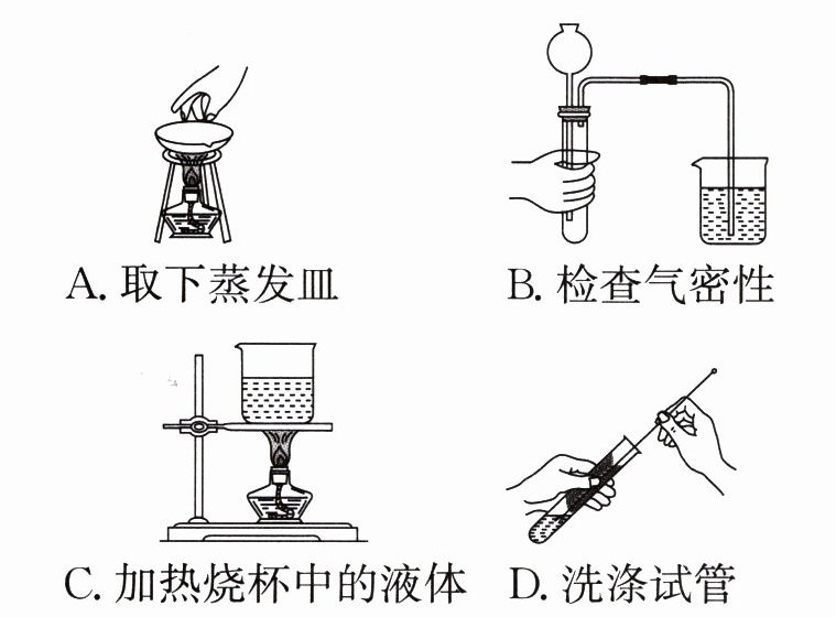 A选项:图中操作会导致烫伤,取下热的蒸发皿应用坩埚钳夹取,不能用手直接拿,故A选项错误。