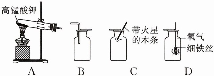D选项:铁丝在氧气中燃烧时,应在集气瓶底部放少量水或铺一层细沙,防止高温熔化物溅落炸裂瓶底,图中集气瓶底部没有做任何处理,故D选项错误。