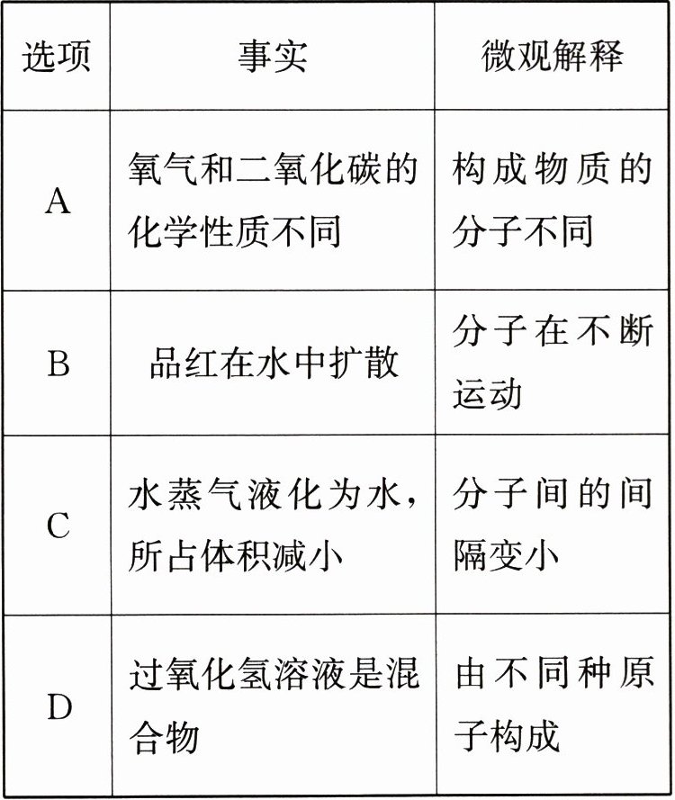 D选项:过氧化氢溶液是混合物,是因为过氧化氢溶液由过氧化氢分子和水分子等不同种分子构成,而不是由不同种原子构成,该选项微观解释错误。