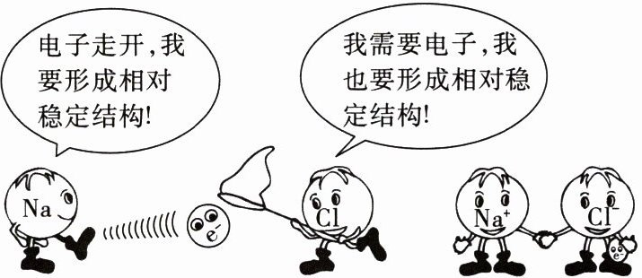 解析:氯化钠固体是由钠离子和氯离子构成的,故A错误;钠原子的质子数为11,核外电子数为11,由原子核外电子的排布规律可知,钠原子的核外电子排布为2、8、1,所以在反应中1个钠原子失去1个电子,形成相对稳定结构,故B正确;氯原子的质子数为17,核外电子数为17,由原子核外电子的排布规律可知,氯原子的核外电子排布为2、8、7,所以氯原子核外有3个电子层,故C错误;Cl、$Cl^-$的质子数均为17,化学反应中质子数不变,故D错误。