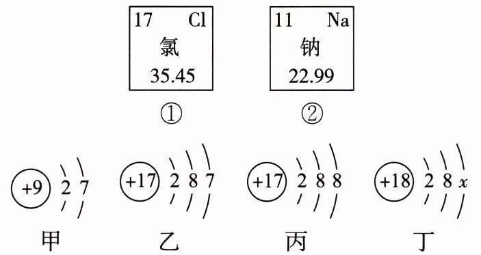 )。 A.氯元素的相对原子质量为35.45 g,粒子丁中$x$的值是8