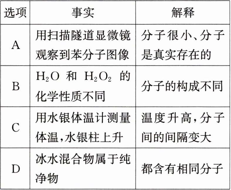 D选项:冰水混合物属于纯净物,是因为冰和水都含有相同分子,即水分子,故D选项解释正确。