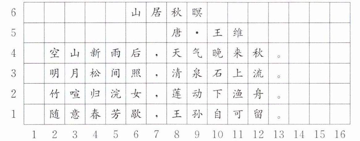 提示:“中”字写在第14列、第3行,“秋”字写在第15列、第4行,“快”字写在第16列、第3行,“乐”字写在第15列、第2行。