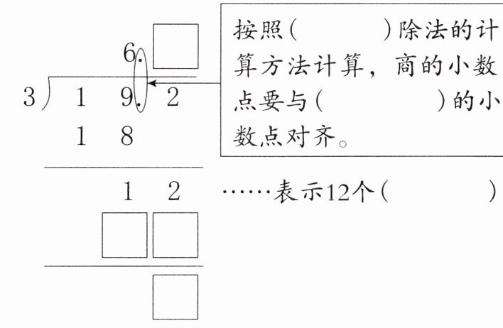 6.4 按照(整数)除法的计算方法计算,商的小数点要与(被除数)的小数点对齐。……表示12个(十分之一)。