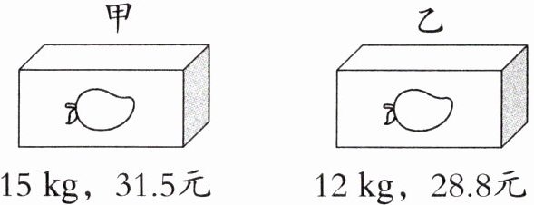 31.5÷15=2.1(元) 28.8÷12=2.4(元) 2.1<2.4 2.4-2.1=0.3(元) 答:买甲种芒果便宜,每千克便宜0.3元。