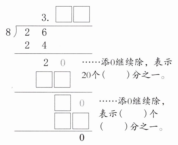 $\begin{array}{r}3.\enspace \Box\enspace \Box \\8\overline{)2\enspace 6} \\\underline{2\enspace 4} \\2\enspace 0 \\\Box\enspace \Box \\\hline\Box\enspace 0 \\\Box\enspace \Box \\\hline0\end{array} $