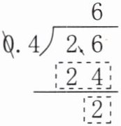 5. 用玻璃瓶分装$2.6kg$蜂蜜,每个玻璃瓶最多可装$0.4kg$蜂蜜。可装满几个玻璃瓶?还剩多少千克?右边竖式计算中虚线部分表示(