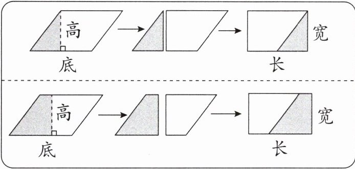 如上图,平行四边形通过割补法可以转化成长方形,拼成的长方形的面积与原来平行四边形的面积(