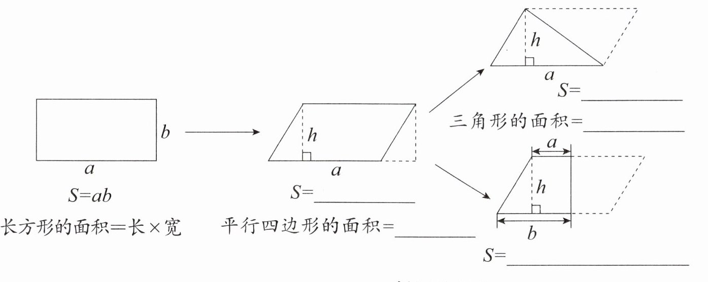 故答案依次为:$ah$;底$×$高;$\frac{1}{2}ah$;$\frac{(a + b)h}{2}$。