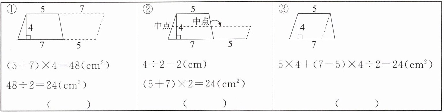 (2)答案不唯一,示例:① 同学①把两个一样的梯形拼成一个平行四边形。平行四边形的底等于梯形的上底与下底之和,高等于梯形的高,可得平行四边形的面积为(5+7)×4=48(cm²)。梯形的面积是平行四边形面积的一半,即48÷2=24(cm²)。