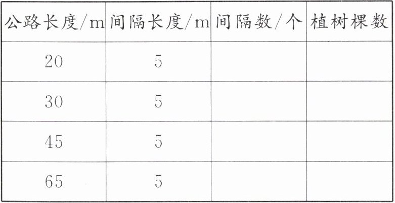 )棵树处。(相邻两棵树间距一致)(3)在某条公路的一边栽树,每隔5m栽一棵(两端都要栽),完成下表。