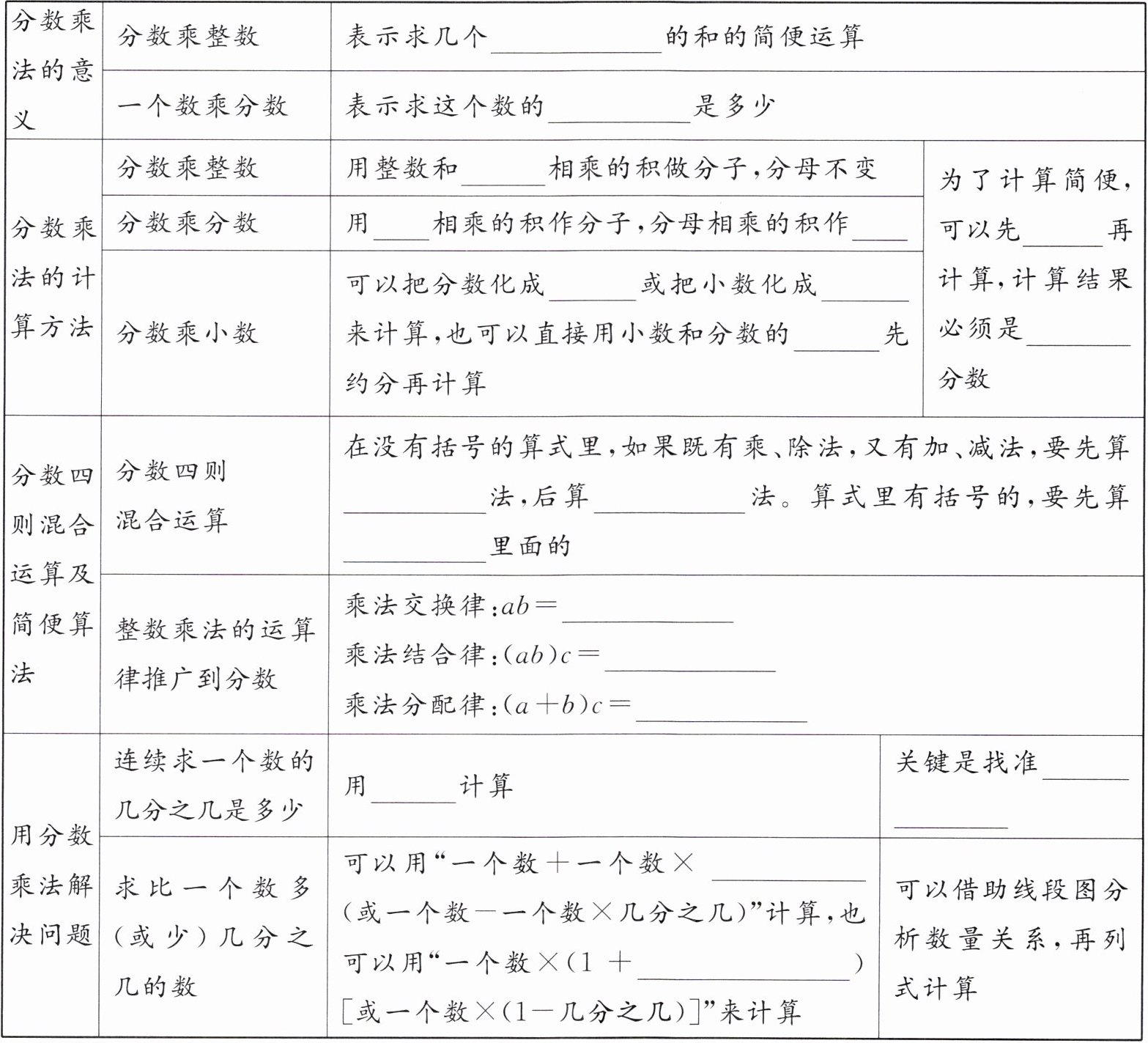 相同加数;几分之几;分子;约分;最简;分子;分母;小数;分数;分母;最简;乘除;加减;括号;$ba$;$a(bc)$;$ac + bc$;连乘;单位“$1$”;几分之几;几分之几。
