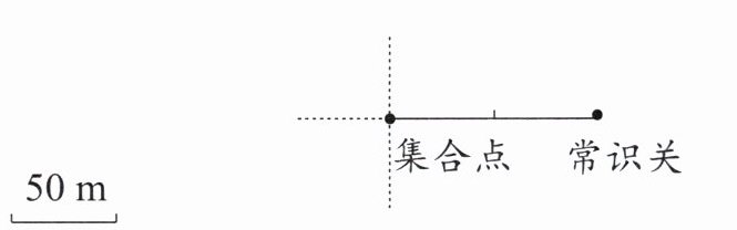 从“集合点”出发,先沿正东方向行100m到达“常识关”,再从“常识关”沿北偏东$40^{\circ}$方向行150m到“古诗背诵关”,然后从“古诗背诵关”沿东偏南$25^{\circ}$方向行100m到“英语拼词关”,最后从“英语拼词关”沿南偏东$45^{\circ}$方向行150m到达“智力拼图关”(终点)。