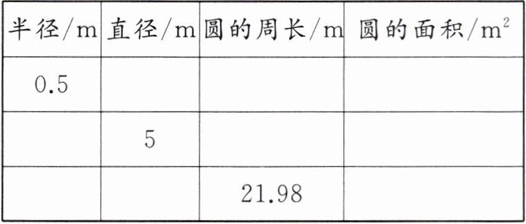 |半径/m|直径/m|圆的周长/m|圆的面积$/m^2$|