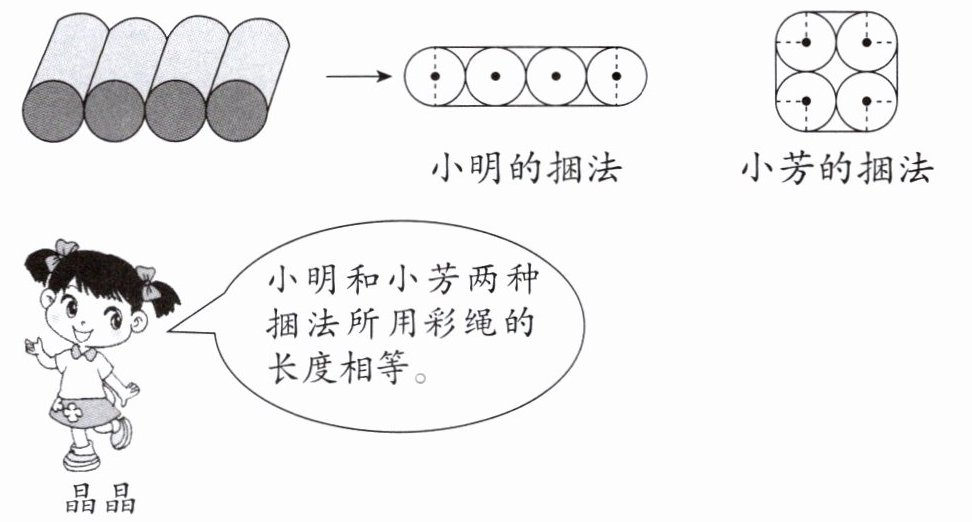 6. 学校开展“卫生纸芯变废为宝”活动。小明和小芳都想到了用纸芯做笔筒,他们分别把4个纸芯摆好后用彩绳捆绑固定,打捆方式如下图所示(打结处彩绳长度不计),已知纸芯的直径约为3cm(纸芯厚度忽略不计)。请你判断晶晶的说法是否正确,并说明理由。