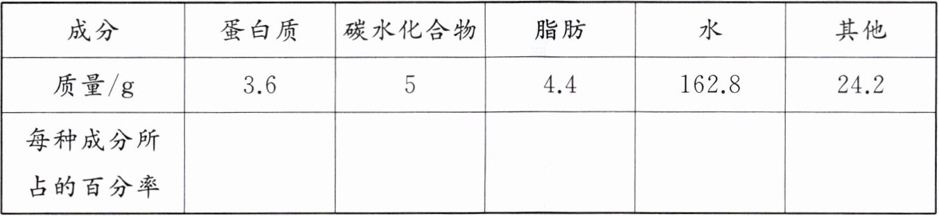 4. 在 200 g 牛奶中,各种成分的质量如下表所示,请把表格填完整。