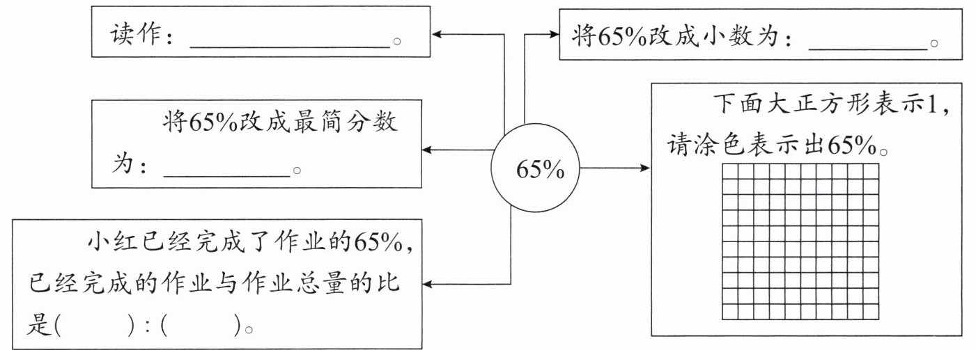 读作:百分之六十五;将$65\%$改成最简分数为:$\frac{13}{20}$;将$65\%$改成小数为:$0.65$;$13$,$20$;涂色部分为$65$个小方格(答案图略)。