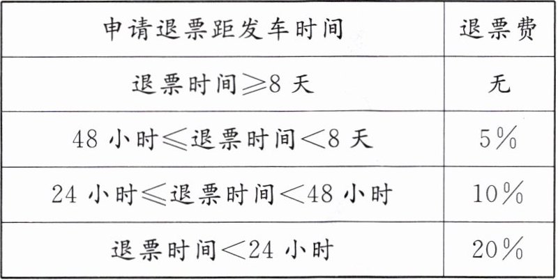 7. 张叔叔计划出差,购买了2025年3月27日9:08出发的车票,票价是28元。由于临时有事,张叔叔2025年3月26日16:00接到取消出差的通知,他立即进行了退票。按照规定,退票需要扣除手续费,具体退票费用如下表所示,张叔叔最终收到的退票款是多少元?