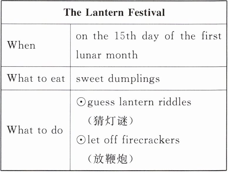 Chinese people celebrate it on the 15th day of the first lunar month and it means the end of the Spring Festival. Usually, Chinese people eat a kind of special food called sweet dumplings. On that day, people go out to watch colorful lanterns and guess lantern riddles with their family members. At night, people also let off firecrackers for fun. It's really interesting. I like the Lantern Festival very much.
