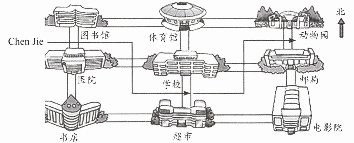 (今天是星期六,Chen Jie 从图书馆出发后,首先前往超市购买了食物,随后前往动物园游玩。)看图写话。 请根据图片里的箭头方向,把下面的短文补充完整,告诉 Chen Jie 该怎么走。