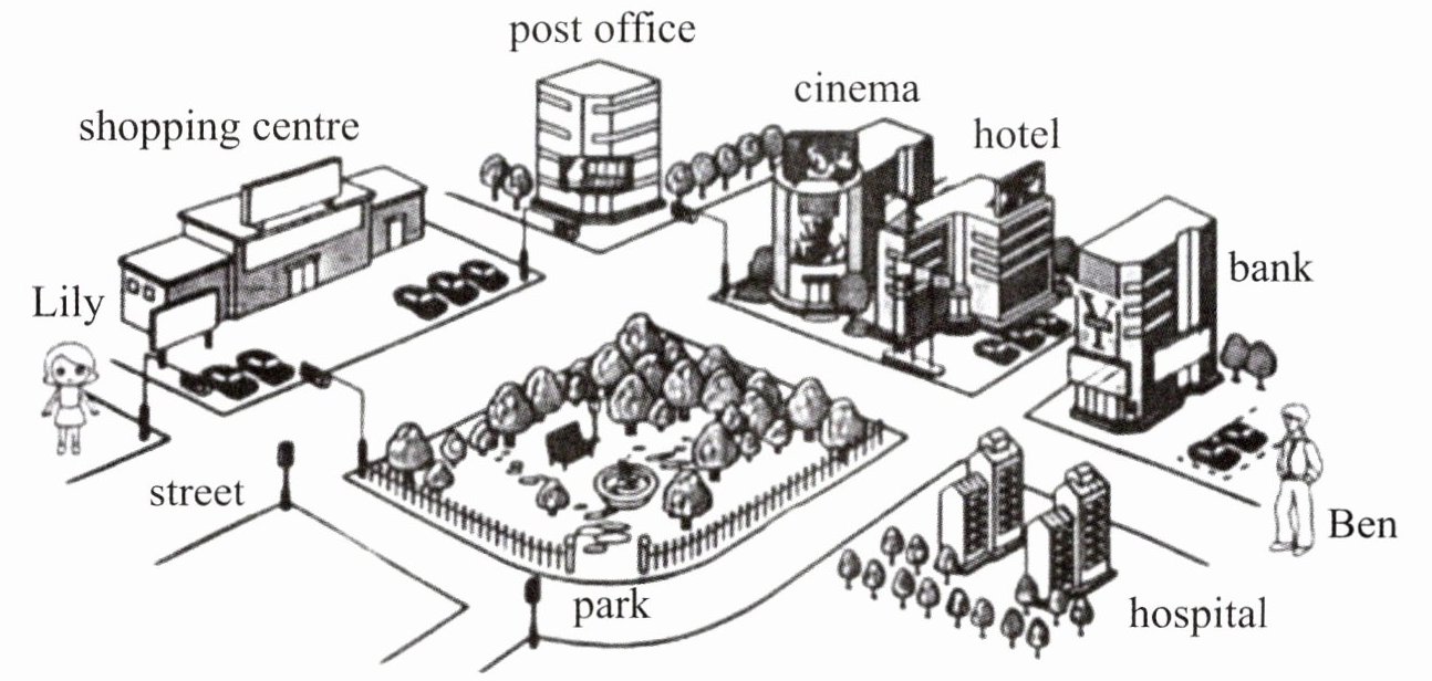 “Lily, go along the street ahead, and turn right at the second crossing. Walk along the road, and the hotel is on your left. It is next to the cinema.”“Ben, go along the street ahead, and turn left at the first crossing. Walk along the road, and the park is on your right. You can't miss it.”