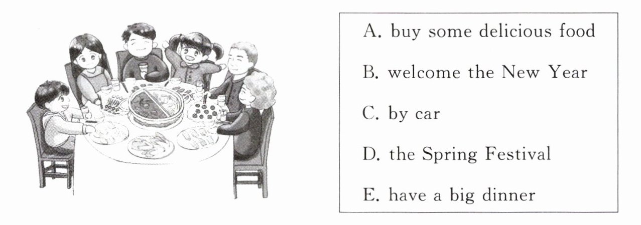 It's near 1. ______ now. It will be the Year of the Snake. We're going to celebrate(庆祝)it with my grandparents. They live in a small village. We're going there 2. ______. Before the day of the festival, we're going to 3. ______, fresh fruit and beautiful flowers. My family are going to get together and 4. ______ on that day. After dinner, all the family will stay up late to 5. ______. I can't wait.