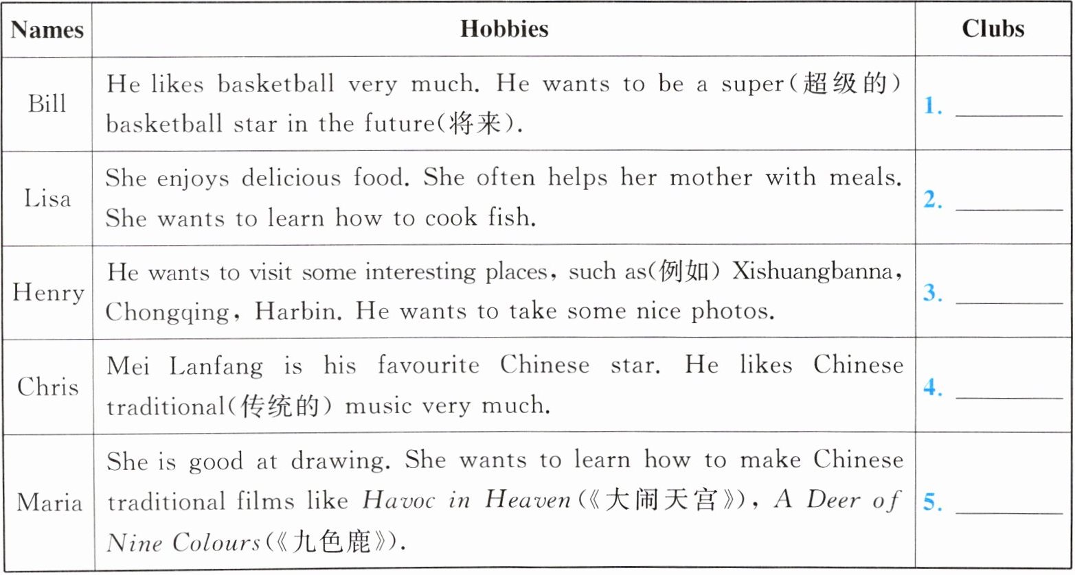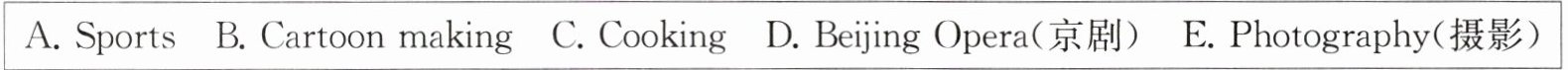 五、(“双减”政策实施以来,众多学校积极响应,纷纷推出了丰富多彩的精品社团课程。)请你根据以下五名同学各自的兴趣爱好,为他们推荐适合的社团课程,将课程序号写在横线上。